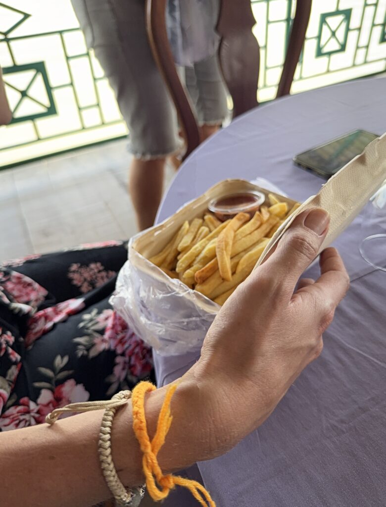 Deshalb bin ich froh, dass unser TukTuk als nächstes unsere Mittagessen-Station anfährt. Ein kleines, ziemlich enges Restaurant mit dem – für mich – bisher besten Essen: Nudeln mit Ei und Gemüse. Maria ist mit Pommes voll bedient, nur die Tomatensoße war sehr knapp …