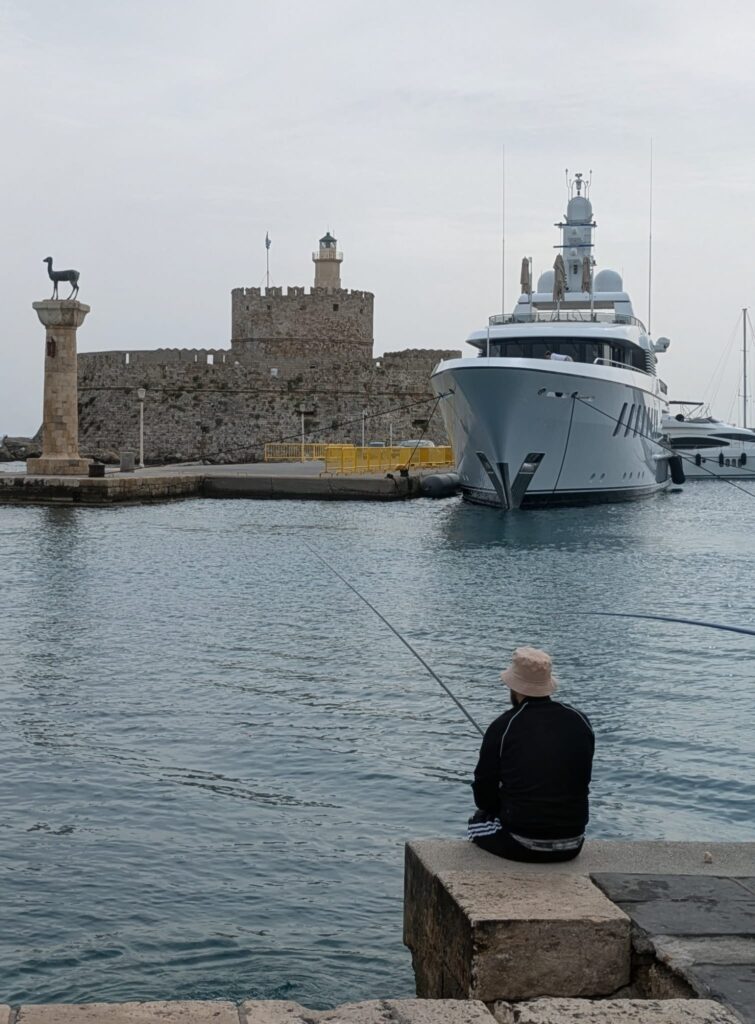 Die gesamte Stadtrundfahrt dauert keine zwanzig Minuten – dann sind wir wieder im Hotel. Es gibt auch nicht viel zu sehen, um ehrlich zu sein. Im Wesentlich nur alte kaputte Steine, die mal zu irgendwelchen Tempeln verbaut waren. Das Übliche halt in Griechenland. Selbst den berühmten „Koloss von Rhodos“ können wir nicht bestaunen, weil er gar nicht mehr existiert. Man ist sich nicht einmal sicher, wo er überhaupt gestanden haben soll. Stattdessen sind jetzt der Hirsch „Elafos“ und die Hirschkuh „Elafina“ die Wahrzeichen des Hafens.
