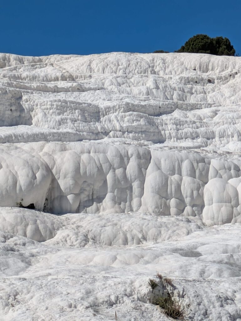Wir verlassen Europa und ziehen nach Asien um. Im Hafen von Rhodos (dort, wo unser ältester Teilnehmer in die Scooter gefallen ist) wartet ein Katamaran auf uns, also ein Schiff mit etwa 300 Sitzplätzen. Genug für vier RSD-Busse. Lange Schlangen vor der Ausweiskontrolle. Und – tata! – der erste Stempel in meinem nagelneuen Pass! Nach 90 Minuten im Hafen von Marmaris in der Türkei das gleiche Spiel. Lange Schlangen, langsame Abwicklung, aber letztendlich ein weiterer Stempel im Pass! Ein neuer Bus mit einem neuen Fahrer, aber dem alten Reiseleiter „Nihat“ fährt mit uns durch wunderschöne Landschaften auf nagelneuen vierspurigen Schnellstraßen und Autobahnen über das Taurus-Gebirge bis nach Pamukkale. Hier gibt es erstaunliche Kalk-Terrassen zu bewundern. Natürlich UNESCO Welt-Kulturerbe (1988). Wir schauen uns alles gründlich an und werden dann im nächsten Hotel in der Nähe der Terrassen abgesetzt. Ich muss dazu sagen, dass ich diese Kalkterrassen schon das zweite Mal bewundern darf. Auch das Thermalhotel, in dem wir übernachten werden, erleide ich bereits zum zweiten Mal. Ich war vor etwa 13 Jahren schon einmal hier. Und schon damals habe ich mich über das unmögliche Hotel aufgeregt. Wir sind für 2026 die ersten Gäste, und entsprechend nervös sind alle Angestellten. Die Zimmer sind schon lange aus der Zeit gefallen, und der ganze Bau riecht nach Mief, bzw. schreit nach Abriss. Man kann zwar allerlei Heilbäder buchen oder sich massieren lassen, aber das ist nicht so mein Ding. Die Sitzordnung wurde – von wem auch immer – vorher festgelegt, sodass ich mal wieder ein paar neue Mitglieder unserer Gruppe näher kennenlerne. Das Essen ist wie üblich lauwarm und nicht weiter erwähnenswert. Geärgert habe ich mich jedoch darüber, dass ich für die Bestellung eines Glases Wein nicht etwa nur meine Zimmernummer angeben muss, sondern auch meinen Zimmer-“Schlüssel“, also die kleine scheckkartengroße Karte abgeben muss, auf der in diesem Hotel die Zimmernummer aufgeklebt ist. Man geht also davon aus, dass ich die Kellner anlügen könnte. Davon abgesehen ist es kontraproduktiv, auf die Zimmerkarten die Zimmernummer drauf zu kleben. Im Falle eines Verlustes oder eines Diebstahls weiß der Finder oder Dieb dann sofort, wo er einzusteigen hat. Ein Glas Wein (0,1 l) kostet übrigens 7,- Euro.