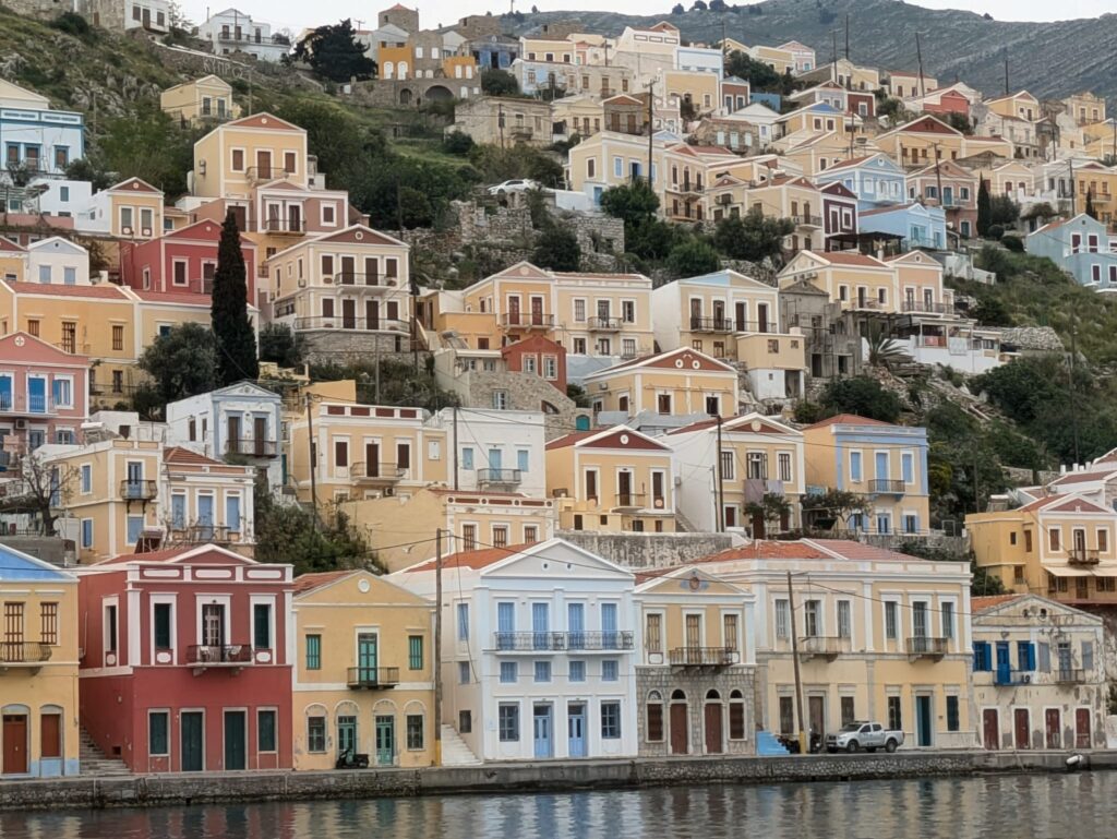 Leider ist das Wetter auf Rhodos alles andere als frühlingshaft. Es regnet zwar erst am Tag vor der Abfahrt, aber die Temperaturen – so zwischen 16 und 20 Grad – fühlen sich nur dann warm an, wenn auch die Sonne scheint. Und das passiert leider nur an den ersten beiden Tagen und während unseres Ausflugs auf die Insel Symi. Sonst ist es immer bewölkt, bis am vorletzten Tag auch noch der Regen hinzukommt.