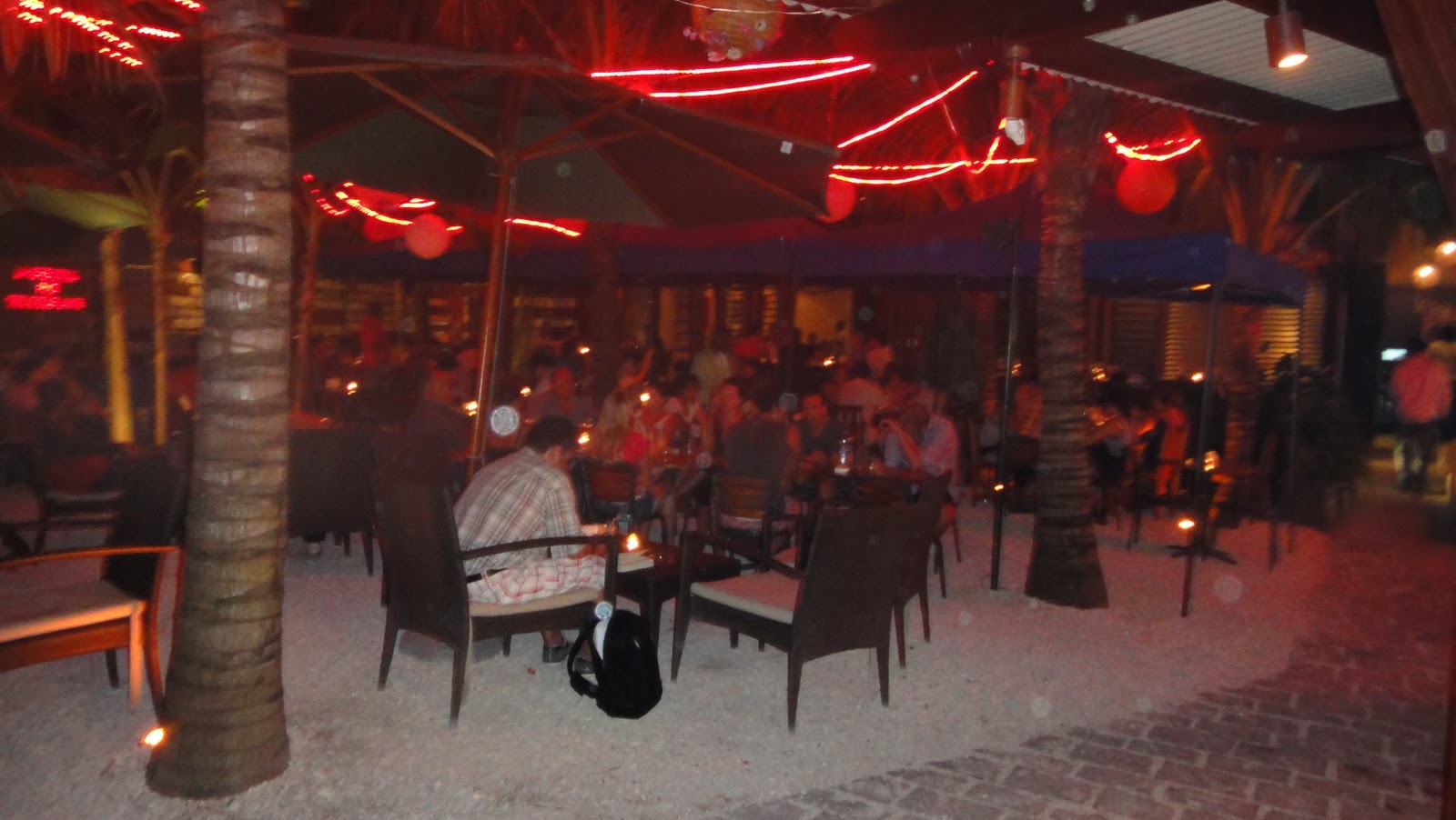 Nach dem Essen laufen wir wieder am Strand entlang zurück in die Kneipe, die wir schon am Mittag besucht haben. Inzwischen ist es gerammelt voll und wir setzen uns direkt an die Bar. Der Weißwein schmeckt ein bisschen nach Sprit, was sich durch Verdünnen mit Eiswürfeln einigermaßen verschleiern lässt. Das Wireless Lan ist kostenlos und viel schneller als im Hotel. Ich kann sogar einen Videoclip runterladen, den mir Nobi geschickt hat. Danke, wir haben sehr gelacht!
