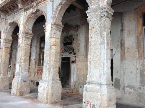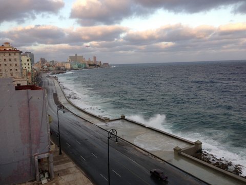 Das Hotel muss direkt nach der Eröffnung sehr schön gewesen sein. Seitdem sind allerdings ein paar Jahrzehnte vergangen und nicht nur der Lack ist abgeblättert. Unser Zimmer liegt im siebten Stock, aber der Fahrstuhl öffnet sich nur im sechsten oder achten Stock. Der siebte klemmt. Nun gut, damit kann man leben. Auch, dass unsere Badezimmertür aufgrund eines fehlenden Schlosses nicht zu schließen ist und infolge irgendwelcher Schwerkraftgesetze stattdessen immer wieder handbreit aufgeht, gehört zu den Unwägbarkeiten des Alltags in Kuba. Schwerer wiegt dann schon, dass man uns kein warmes Wasser gönnt, obwohl auf einem Schild vor heißen 50 Grad gewarnt wird. Definitiv kein Hotel für Warmduscher. Dafür wird man mit einem geilen Blick über die Küste belohnt. Ein wilder, peitschender Ozean tut sein bestes, die letzten noch stehenden Prachtbauten mit seinem Salzwasser zu zersetzen. Ungefähr jedes dritte Gebäude droht zusammenzufallen. Es wäre vermutlich schon lange kein einziger Bau mehr übrig, wenn die Regierung nicht mit vielen Hilfsgeldern aus der ganzen Welt (natürlich außer den USA) versuchen, würde, den Verfall aufzuhalten.