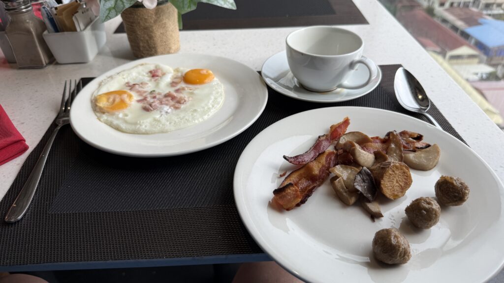 Nach einem – für meine Verhältnisse – sehr ungewohnten Frühstück steigen wir wieder in den Bus. Das Ungewöhnliche am Frühstück ist, dass es größtenteils aus „Mittagessen“ besteht, also Salaten, Suppen, Reis etc. Für uns Touris ist die Auswahl sehr dünn, abgesehen von einem Omelett, das uns vor unseren Augen frisch zubereitet wird.