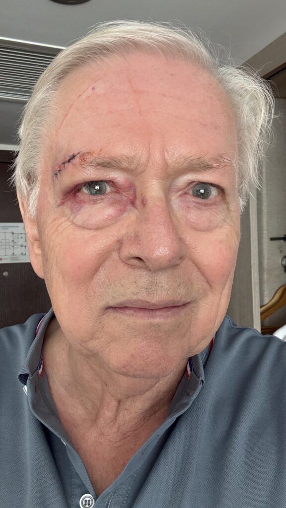 Während wir auf den Krankenwagen warten, bzw. jemanden, der uns ins Krankenhaus fährt, verbinden mir meine Reisekollegen die blutende und angeblich klaffende Wunde über dem rechten Auge.